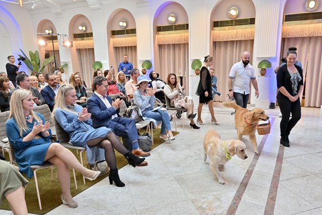 A vendégek legnagyobb örömére Hoppá és Ritmus a két terápiás kutya ismét elkísérték a Kutyajó Móka projekt csapatát Budapestre.